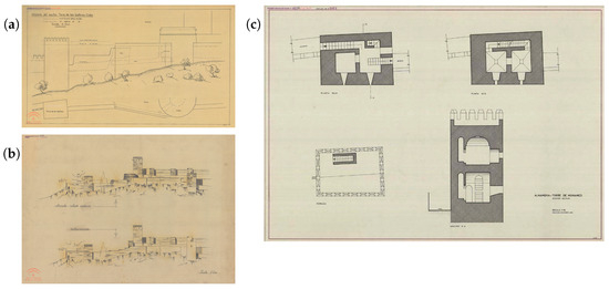 The most accurate information about the geometry of the Tower of Muhammad can be found in the most recent restoration projects [74] and in the pictures and architectural blueprints developed in the second half of the 20th century and preserved in the Archives of the Alhambra, like the ones shown in Figure 5. These data can be complemented and updated with in situ measurements. As a result of all the above, it can be said that the Tower of Muhammad has a trapezoidal plan, with the north and south walls measuring approximately 9 in length, while the west and east walls are 6.6 and 6.0 long, respectively. The tower stands 15.9 high, including 1.2 tall battlements, and the wall thickness varies between 1.45 and 1.80 .
