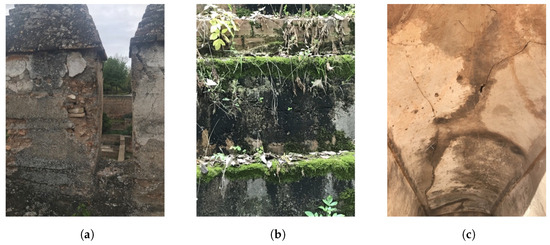 Figure 6. Pathologies found in the Tower of Muhammad: (a) degradation of plaster, (b) biodeterioration, and (c) surface cracking. - Biodeterioration due to the growth of parasitic vegetation, leading to cracking and partial loss of the lime plaster (Figure 6b).