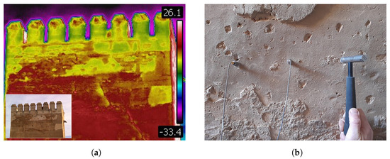 The detection of pathologies was first performed via visual inspection, as several defects were clearly visible on the walls. A crackmeter was used to measure the displacements across surface cracks and joints. Additionally, to locate further structural alterations on the walls and measure the crack depth, an infrared thermography study of the tower was conducted (Figure 7a) using a FLIR T420bx infrared camera, with thermal sensitivity below 0.045 °C and a 320 × 240 MSX sensor.