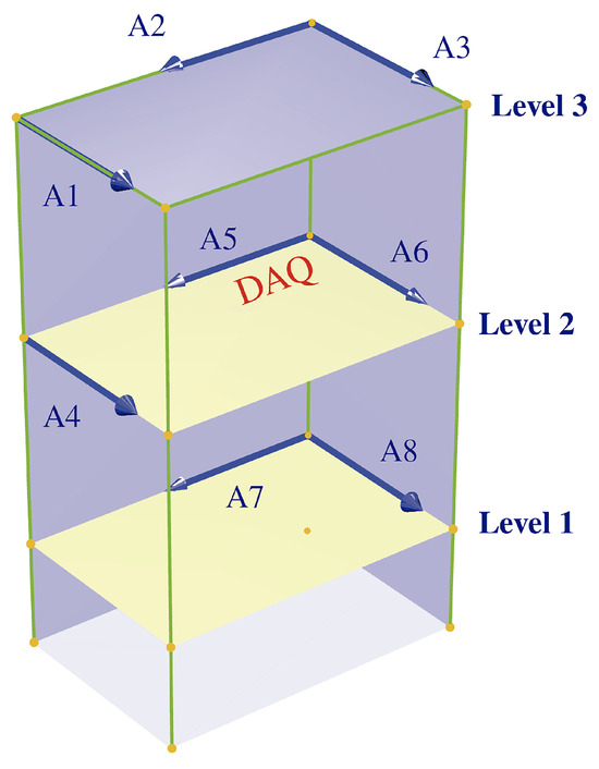 To assess the current state of the tower, in addition to periodic on-site inspections, a continuous monitoring system was installed in January 2022. The system consists of eight high-sensitivity piezoelectric accelerometers, model PCB393B31 ( 5% 10.0 −1, wideband resolution 1 rms, and measurement range 0.5 pk). The sensors, protected by waterproof metal cases placed directly on the ground, were installed on the three levels of the tower, as shown in Figure 8. Accelerometers A1 and A4 were positioned at the northwest corners of levels 3 and 2, respectively, in a unidirectional configuration, while the remaining sensors were placed in pairs (in a bidirectional configuration) at the northeast corners of all three levels of the tower. The sensor placement was determined based on the authors’ experience following a preliminary inspection of the tower.