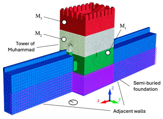 To create a structural digital twin of the tower, a three-dimensional finite element model was developed using ABAQUS software (Figure 9). The model’s geometry was constructed using information from available blueprints and in situ inspections. The vaulted floors, openings, interior stairs, and battlements were included in the model. Additionally, sections of the adjacent walls of the Alhambra were also included. To balance computational efficiency and accuracy, only small sections of the walls, each 15 long (determined by a preliminary sensitivity analysis), were included in the model. The foundations of the walls and the tower are considered fixed, while the lateral interaction with the ground for the buried portion of the tower and adjacent walls is modeled using elastic springs. The model uses four-node linear tetrahedral elements (C3D4) with an average size of 0.50 , determined through a convergence analysis that increased the mesh density until variations in the resonant frequencies fell below approximately 0.25%, resulting in a total of 70,898 nodes and 345,642 elements.