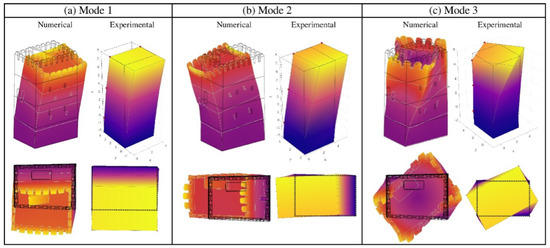 Given the uncertainty over the material properties of the tower, the finite element model was inversely calibrated by a simple model updating approach based on linear sensitivity analysis using the first experimental modes (resonant frequencies and mode shapes), resulting in the mechanical parameters shown in Table 3. The calibrated model achieved an average error in frequency of 1.28% and a minimum modal assurance criterion (MAC) value of 0.94. Figure 10 shows a comparison between the first three mode shapes derived from experimental data and those obtained from the numerical model. Interested readers can find further details on the finite element model updating approach in reference [34].