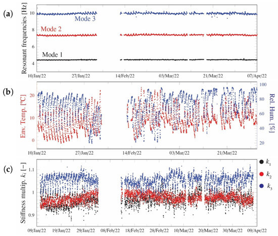 Once the digital twin is created, the structural identification procedure is sequentially applied to each dataset from the sampling period (January to March 2022). This procedure involves solving the nonlinear optimization problem of minimizing the objective function considering the differences between experimentally determined vibration modes and their theoretical counterparts (refer to [34] for further details). Time series of identified resonance frequencies, ambient temperature, and relative humidity are shown in Figure 11a,b. Additionally, time series of the stiffness multipliers are presented in Figure 11c. It is observed that environmental effects are also reflected in the adjusted stiffness multipliers. Specifically, the upper macro-element of the tower () shows particular sensitivity, while and exhibit lower sensitivities.