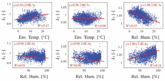 To further analyze the sensitivity of the stiffness parameters, Figure 12 displays the correlation analysis between the adjustment parameters and environmental conditions. In this figure, linear fits are included to illustrate the sign of the correlations. These results confirm the previous analysis, indicating that the upper macro-element () is the most sensitive. Interestingly, there is a positive correlation between this stiffness multiplier and ambient temperature, while the effect of relative humidity is the opposite. It is important to note that the sensitivity of the modal characteristics of the tower to variations in the upper macro-element is minimal, requiring in-depth calibration analysis (preferably through Bayesian inference) to confirm this behavior. Opposite trends are observed in the correlations for the stiffness parameter of the lower macro-element (). This behavior aligns with the correlations seen for resonance frequencies, which increase with temperature, while increased humidity results in a material stiffness reduction. Notably, the use of the Kriging meta-model allows for inverse calibration in approximately 7 , making the proposed approach fully compatible with long-term SHM. Lastly, it is important to note that the large variances in the fitting parameters in Figure 12 may hinder the identification of small damages. To address this issue, a proper statistical pattern recognition technique should be adopted to remove benign variations induced by environmental conditions, such as artificial neural networks, nonlinear principal component analysis, or independent source separation techniques. Interested readers can refer to references [80,81] for a comprehensive state-of-the-art review of data normalization techniques for removing environmental effects on SHM data.