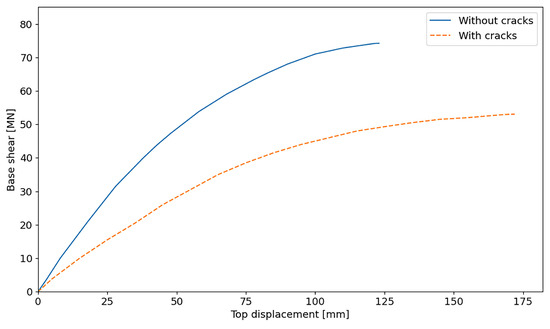 Pushover curves for the FEM model without cracks and the XFEM model with crack propagation.