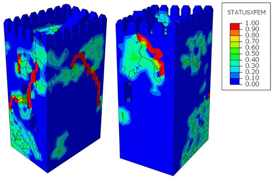 The progression of cracks during the pushover test can be monitored using the variable STATUSXFEM, which ranges from 0 to 1, where a value of 0 indicates that the enriched element contains no cracks and a value of 1 indicates that the element is completely cracked. The state of this variable at the end of the test is shown in Figure 15, where it is possible to observe damage mainly in the upper part of the tower on all of its sides and in the lower part of the tower, mainly in the north and west walls. The areas with crack propagation damage obtained in the XFEM model coincide with the regions of the tower that show a more precarious state of conservation, presenting cracking and spalling.