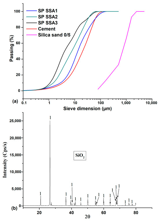 (a) Granulometric analysis of cement and crushed sand; (b) X-ray diffraction analysis of crushed sand [8].
