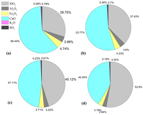 Chemical composition of cement: (a) cement substituted with 10% of sand powder (SP); (b) cement substituted with 20% of SP; (c) cement substituted with 30% of SP; and (d) cement substituted with 40% of SP.