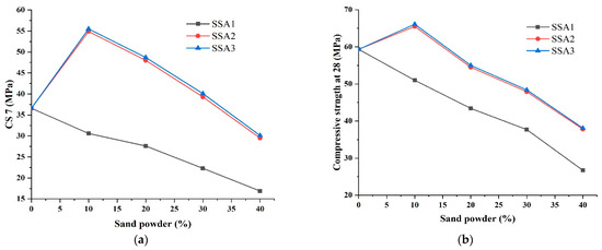 Effect of substitution ratio of cement on mechanical properties of mortar at 7 and 28 days (a) compressive strength at 7 days and (b) compressive strength at 28 days.