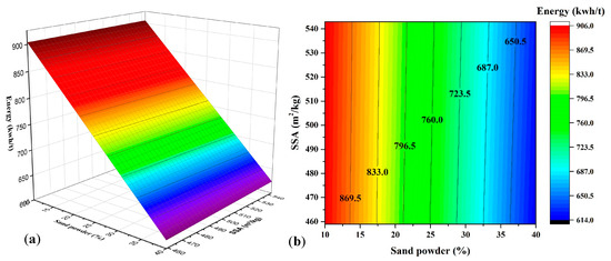 (a) Iso-response surfaces of the energy consumption for the production one ton of cement; (b) Iso-response curves of the energy consumption for the production one ton of cement.