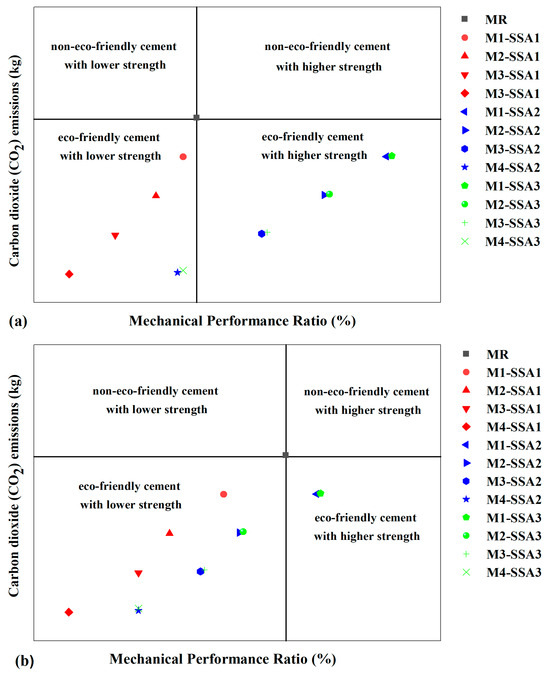Mechanical performance ratio (MPR) and effective carbon dioxide emission reduction (a) at 7 days and (b) 28 days.