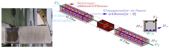 Three-point bending test setups for beams with a length of 1.5 m were chosen to apply bending and shear simultaneously. The material properties are consistent across all specimens (concrete compressive stress (MPa)), with a rebar yield limit (MPa) and a steel tube yield limit (MPa).