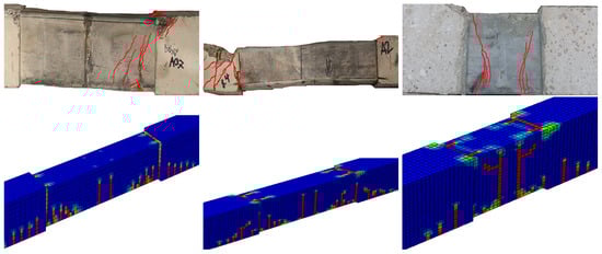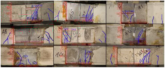 The capacity results of these tests are presented in Table 1. The table includes the values of each geometrical parameter and the maximum shear and bending moment in the section at the failure moment. These values correspond to the maximum force applied by the testing machine and are discussed later to identify the type of failure in each setup. For instance, in the first example, for a section with a 15 cm height, a 10 cm width, and three rebars ( mm), using a tube with 6mm thickness and 20 cm length pushed by a post-tensioning force of 43 kN, the shear and bending amounts at the failure moment are kN and kN·m, respectively. After the experimental tests, the steel tubes of the joint elements were cut to examine the failure modes inside the tubes properly. Figure 2 displays the failures of some of the beams inside the tubes (cut after the test). In most selected tests, the main cracks occurred around 5 cm from the edge of the tube. However, not all elements exhibited similar performance, and variations in geometrical parameters led to different failures, including failures outside the tube in the concrete section, which is the most desirable type. Hence, in the next section, examples with different failure types and locations are selected to describe the calculation approach.