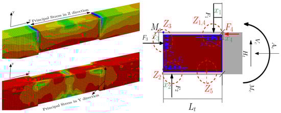 Figure 3, in addition to displaying the forces based on FE analyses, illustrates the principal stresses in two perpendicular directions, according to the experimental tests and defined forces (failure zones). During the loading process of the joint, five zones (labeled ), as illustrated in Figure 3 based on experimental and numerical results, have a high probability of failure. To estimate the capacity, the forces in these regions must be statically calculated and compared to the elements’ capacity in each zone. The equations presented in this study are adaptations of the known calculations for pocket column foundations [23]. In addition to geometric parameters, four forces () and three friction components () are considered in defining the equations.