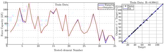 The training performance of the ANFIS model for predicting force capacity. The left plot shows the alignment of predicted (red) and actual values (blue), and the right plot indicates a high correlation (R = 0.99811), reflecting excellent accuracy.