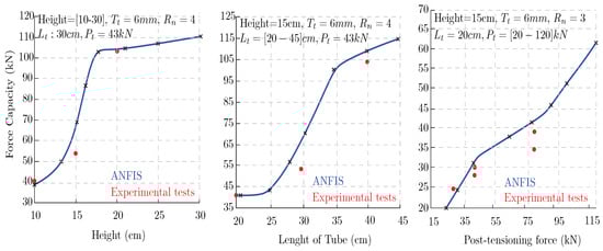 To evaluate the ability of the ANFIS model to represent the proposed complex calculation, especially in setups with non-tested features, a comparison was made between the discrete original results of the experimental tests (Table 1) and the continuous ANFIS results. Figure 6 illustrates the differences between the original discrete data and continuous results while varying the section’s height, length of the tube, and post-tensioning forces as selected parameters. The maximum error in these complex operations with multiple geometrical parameters was observed in evaluating the post-tensioning force, where ANFIS calculated the capacity to be higher than the testing results. Different adjustments (e.g., , , , or the number of epochs) in coding ANFIS did not significantly reduce the error. However, it should be noted that a larger look-up table size could potentially help ANFIS moderate the error.