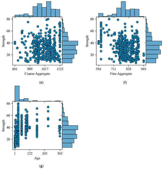 Joint distribution plot: (a) cement and strength; (b) fly ash and strength; (c) water and strength; (d) superplasticizer and strength; (e) coarse aggregate and strength; (f) fine aggregate and strength; (g) age and strength.