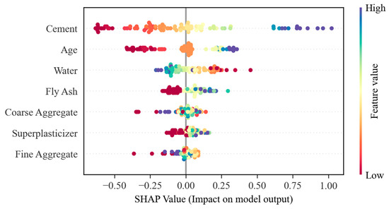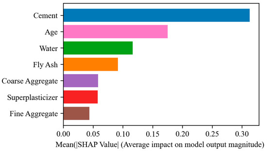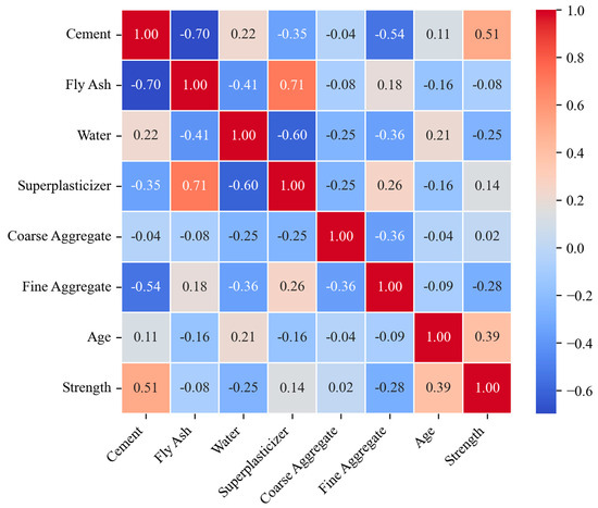 In particular, a robust positive correlation is evident between cement and compressive strength (correlation coefficient of 0.51), whereas a negative correlation is observed between fine aggregate and compressive strength (correlation coefficient of −0.28). The negative correlation is a consequence of the excessive use of fine aggregates, which may result in a reduction in the internal structural density of concrete and, consequently, in a decline in compressive strength. In order to address this issue, the model is subjected to regularization during the training process, thus preventing an excessive reliance on a specific feature. This approach serves to mitigate the impact of the negatively correlated feature on the final prediction results. Figure 2 provides a clear representation of the relative relationships between the variables, which serves as a crucial reference point for analyzing the influence of input parameters on compressive strength.