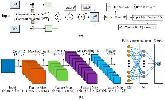 Figure 4. CNN model: (a) Conv1D and MaxPooling1D; (b) algorithm flow chart.