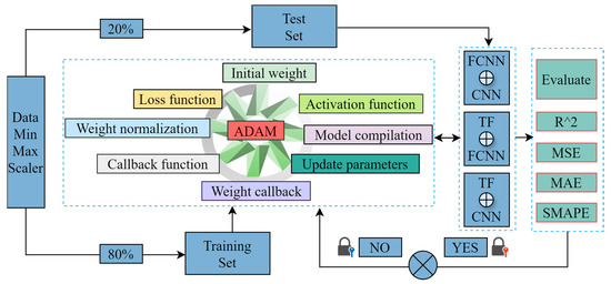 The FCNN model employs 128 and 64 hidden nodes, which are identified through experimental tuning and cross-validation, to achieve an optimal balance between model performance and the risk of overfitting. The performance of the model may be affected by the size of the hidden layers, with larger layers increasing the risk of overfitting and smaller layers potentially lacking the capacity to capture sufficient feature information. The aforementioned node configuration is demonstrated to facilitate enhanced prediction accuracy while circumventing overfitting during model optimization by integrating the error assessment of the training and validation sets. The flow of the FCNN model algorithm is illustrated in Figure 3.