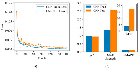 CNN model: (a) loss function curve; (b) evaluation metrics.