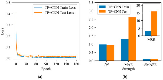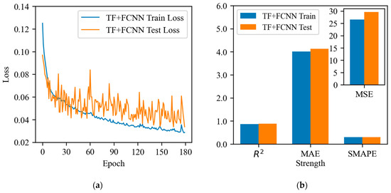 The total loss function curves and evaluation indexes of the six models for the training data and test data of the same dataset are presented in Figure 7, Figure 8, Figure 9, Figure 10, Figure 11 and Figure 12. The loss function change curves of the six models can be observed in the dynamic process of model training. In the case of model parameter consistency, the training and test losses of the FCNN, FCNN + CNN, and TF + CNN models all decrease rapidly in the early stage and eventually stabilize, indicating that these three models exhibit superior training effects and stability. In contrast, the CNN and TF + FCNN models also decrease rapidly, but the test loss fluctuates slightly. This suggests that the training effect and stability of these three models are superior. However, the training and testing losses of the CNN and TF + FCNN models also decrease rapidly, yet the fluctuation of the testing loss is slightly larger, indicating the presence of a certain degree of overfitting. The training and testing loss of the TF model gradually decreases, but the fluctuation of the testing loss is larger, indicating that the stability of its model requires improvement.