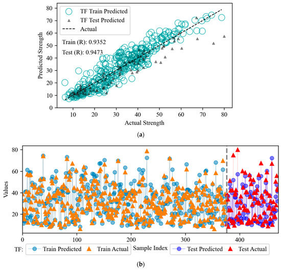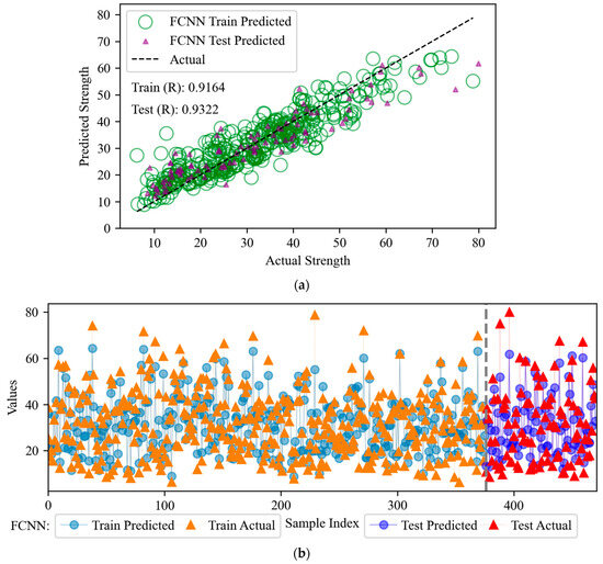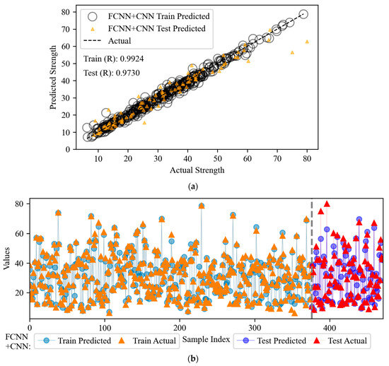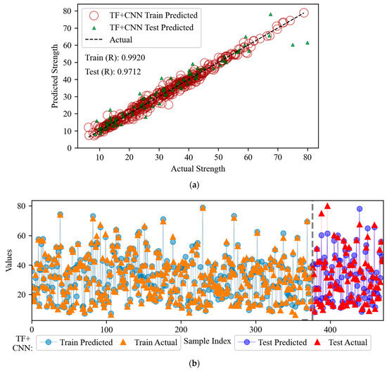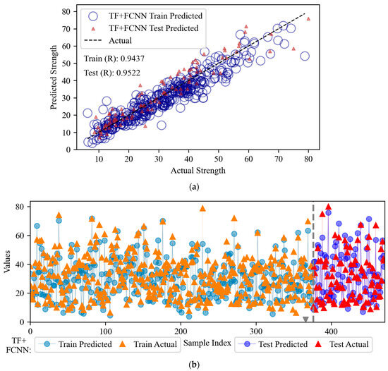 In this study, various models (FCNN, CNN, TF, and hybrid models) are used to predict the compressive strength of fly ash-based concrete. Table 2 shows a detailed analysis of the advantages and disadvantages of each model. FCNN is preferred for small datasets, CNN for image data, and TF for sequence data; FCNN is preferred when resources are limited, and the hybrid model is more advantageous when pursuing high accuracy and complex input data. In this paper, the FCNN + CNN hybrid model combines the local feature extraction ability of CNN and the global feature learning ability of FCNN, which can capture both fine-grained information and global patterns, and improve the accuracy and generalization ability of the model. The TF + FCNN model takes advantage of the sequential modeling ability of TF and the feature integration ability of FCNN, which can efficiently capture the complex patterns and long-range dependencies. The TF + CNN model combines the local feature extraction ability of CNN with the feature integration ability of FCNN, which can effectively capture the complex patterns and long-range dependencies. The model combines the local feature extraction of CNN with the global feature modeling of TF to achieve more efficient feature representation.