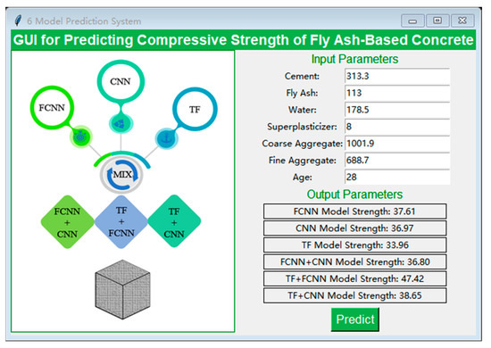 The compressive strength of concrete is a crucial parameter in structural design, yet its determination in a laboratory setting is both time-consuming and expensive. The prediction of compressive strength in fly ash-based concrete can be accelerated through the use of machine learning algorithms with artificial intelligence, which can effectively address the problems associated with this process. This paper presents the most innovative model algorithms established based on artificial intelligence technology. These include three single models—a fully connected neural network model (FCNN), a convolutional neural network model (CNN), and a transformer model (TF)—and three hybrid models—FCNN + CNN, TF + FCNN, and TF + CNN. A total of 471 datasets were employed in the experiments, comprising 7 input features: cement (C), fly ash (FA), water (W), superplasticizer (SP), coarse aggregate (CA), fine aggregate (S), and age (D). Six models were subsequently applied to predict the compressive strength (CS) of fly ash-based concrete. Furthermore, the loss function curves, assessment indexes, linear correlation coefficient, and the related literature indexes of each model were employed for comparison. This analysis revealed that the FCNN + CNN model exhibited the highest prediction accuracy, with the following metrics: R2 = 0.95, MSE = 14.18, MAE = 2.32, SMAPE = 0.1, and R = 0.973. Additionally, SHAP was utilized to elucidate the significance of the model parameter features. The findings revealed that C and D exerted the most substantial influence on the model prediction outcomes, followed by W and FA. Nevertheless, CA, S, and SP demonstrated comparatively minimal influence. Finally, a GUI interface for predicting compressive strength was developed based on six models and nonlinear functional relationships, and a criterion for minimum strength was derived by comparison and used to optimize a reasonable mixing ratio, thus achieving a fast data-driven interaction that was concise and reliable.