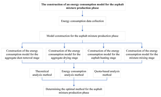 Therefore, this study focuses on the production phase of asphalt mixtures during both summer and winter, analyzing energy consumption sources and conducting data investigations. It involves calculating and comparing energy consumption for the production of base asphalt AC-25, SBS-modified AC-20, SBS-modified AC-13, and SBS-modified SMA-13 mixtures using theoretical methods, field measurements, and standard quota methods. This study also aims to construct an energy consumption model for the production phase, considering factors such as seasonality, mixture types, energy types, mixing time, mixing quality, and asphalt heating temperature. The research process is illustrated in Figure 1.