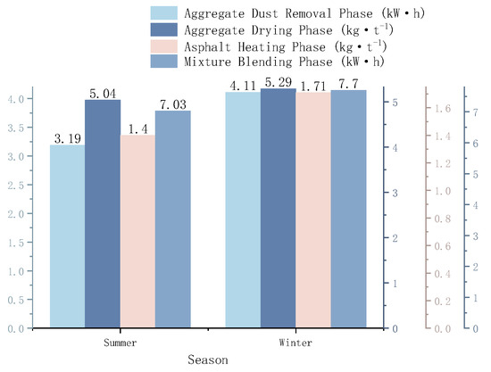 During measurements, external environmental factors (such as temperature, humidity, and wind speed) can significantly affect the equipment and measurement conditions, particularly across different seasons. Variations in these conditions may lead to deviations in measurement results. The accuracy of the measurement equipment is limited, which can result in systematic biases in energy consumption data. Some parameters used in the model (such as process parameters during asphalt mixture production) may be approximations derived from experiments or the literature rather than precise values, introducing a certain level of uncertainty [24]. By further consolidating the data from Figure 3, Figure 4, Figure 5 and Figure 6 into Figure 7, the energy consumption during the stages of aggregate dust removal, aggregate drying, asphalt heating, and mixture blending is quantified for both summer and winter seasons. In the summer, the energy consumption for each stage is as follows: 3.196 kW·h, 5.04 kg·t−1, 1.401 kg·t−1, and 7.028 kW·h, respectively. In the winter, the corresponding energy consumption values are 4.109 kW·h, 5.296 kg·t−1, 1.705 kg·t−1, and 7.699 kW·h. By multiplying these energy consumption values by the net calorific value coefficient (NCVi), the total energy consumption can be calculated.