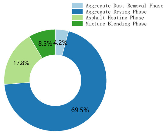 Figure 8 illustrates that the total energy consumption distribution across the stages is as follows: aggregate dust removal accounts for 4.23%, aggregate drying for 69.50%, asphalt heating for 17.75%, and mixture blending for 8.52%. The primary energy consumption during the asphalt mixture production phase is concentrated in the aggregate drying and asphalt heating stages, with relatively lower energy consumption observed in the aggregate dust removal and mixture blending stages. This is because the aggregate drying stage requires a significant amount of heat for the moisture in the aggregates to evaporate, and the aggregates must also absorb substantial heat to raise their temperature to the level required for mixture blending [27].