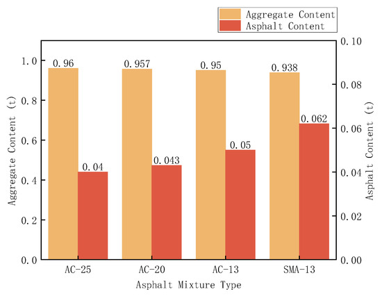 Regarding the differences caused by different mix types, the SMA (Stone Mastic Asphalt) mixture uses high-quality, specific-sized aggregates and modified asphalt, requiring higher temperatures and longer mixing times during production. Modified asphalt needs more energy to heat and maintain an appropriate viscosity compared to ordinary base asphalt. Larger aggregate sizes result in a relatively reduced heating and mixing time per unit volume of the mixture [32,33].