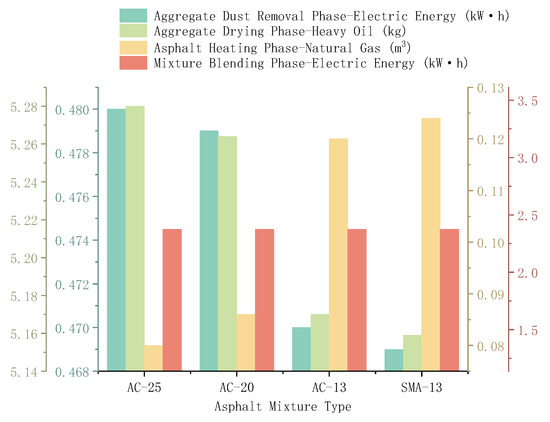 By applying the quota for 1000 m3 of different asphalt mixtures—coarse-graded asphalt mixture (AC-25 matrix asphalt mixture), medium-graded modified asphalt mixture (AC-20 modified asphalt mixture), fine-graded modified asphalt mixture (AC-13 modified asphalt mixture), and stone matrix asphalt (SMA-13 modified asphalt mixture)—the consumption of heavy oil and electricity for mixing equipment is determined. This allows for the calculation of the total liquid fuel and electricity consumption required to produce 1000 m3 of AC-25 matrix asphalt mixture, AC-20 modified asphalt mixture, AC-13 modified asphalt mixture, and SMA-13 modified asphalt mixture.