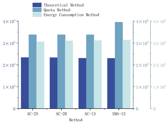 The comparison of energy consumption from different methods is shown in Figure 11. It can be observed that the total energy consumption is as follows: quota method > energy consumption modeling > theoretical method. Additionally, the energy consumption for different asphalt mixtures is ranked as follows: SMA-13 modified asphalt mixture > AC-13 modified asphalt mixture > AC-20 modified asphalt mixture > AC-25 base asphalt mixture.
