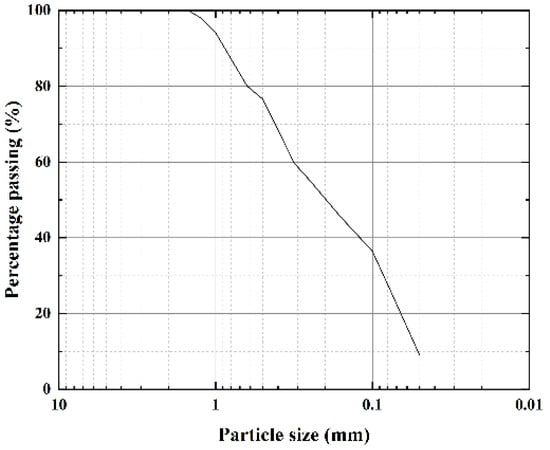 The soil used in this test was collected from Lanzhou City, Gansu Province. Based on the soil classification standard [], it is classified as silt. The particle size-distribution curve of the soil is illustrated in Figure 1. The basic physical properties of the soil are listed in Table 1.
