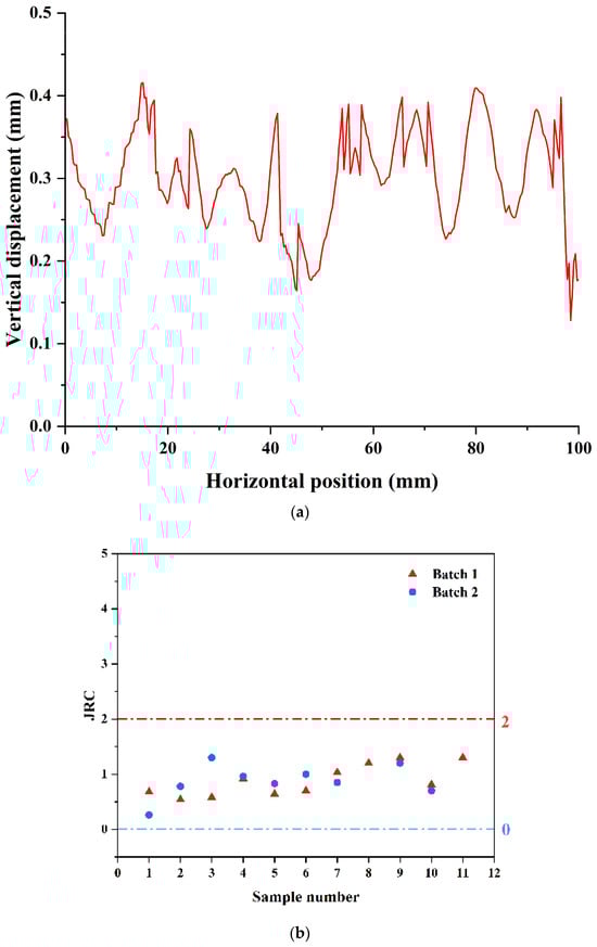 Roughness is a crucial parameter that influences the geotechnical behavior of the interface. After the concrete sample is completed, the concrete surface profile is measured using a CMOS micro laser displacement sensor (with a laser diameter is approximately 50 μm and a repeatability accuracy of around 10 μm) to obtain the parameters of the concrete surface contour. Figure 2a shows a typical contour line of the sample surface. Using the evaluation method of R. Tse and D.M. Cruden [], the joint roughness coefficient (JRC) can be calculated []. The calculation equation is as follows: