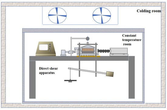 To achieve precision control of the test temperature, a dual temperature control system was employed, including a cold room and a constant temperature chamber. The direct shear apparatus was installed in the constant temperature chamber, as shown in Figure 4. The cold room mainly includes temperature control and ventilation systems, and its exterior is constructed from insulation panels with excellent thermal insulation performance. The dimensions are 5 m × 2.8 m × 2.8 m, and the temperature control accuracy is ±0.5 °C. The constant temperature chamber uses a 1~3.5 Hp DC variable frequency condensing unit with an overall size of 2.0 m × 1.2 m × 1.8 m, providing temperature control precision up to ±0.2 °C.
