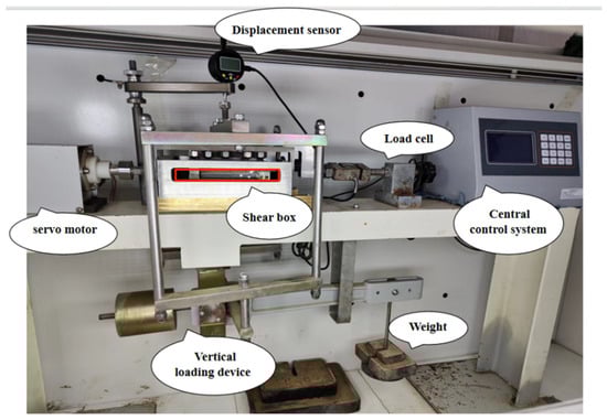 The direct shear test instrument uses a liquid crystal micro-controlled shear instrument (Figure 5), including a vertical load unit, a horizontal load unit, a data acquisition system, a shear box, a displacement meter, etc. The shear box size is 100 mm × 100 mm × 50 mm, and the upper and lower boxes’ heights are both 25 mm. In order to conduct mesoscopic mechanism research, a 100 mm × 20 mm opening is made on the side wall of the shear box for shear-band image photography, as shown in the red area in Figure 5. At the same time, an acrylic sheet is placed at the opening to prevent the soil from being squeezed out during the test.