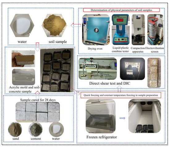 The design of the direct shear test scheme was based on existing test studies and geotechnical test specifications, aiming to investigate the shear characteristics of the interface between construction materials and soil under different conditions [,]. The test process is shown in Figure 6. The test conditions include normal stress (σn = 25 kPa, 50 kPa, 75 kPa, 100 kPa), soil water content (the optimal water content of the test soil was found to be 13.3%, so the test set the water content at w = 10%, 13%, 16%, 19%), test temperature (T = 20 °C, −2 °C, −4 °C, −6 °C), and shear rate (v = 0.1 mm/min, 0.4 mm/min, 0.8 mm/min, 1.2 mm/min).