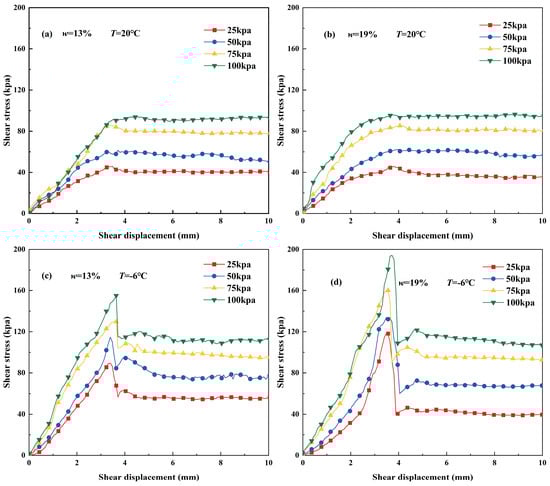 Shear stress–shear displacement curves under different normal stresses. (a), water content w = 13% and temperature T = 20 °C; (b), water content w = 19% and temperature T = 20 °C; (c), water content w = 13% and temperature T = −6 °C; (d), water content w = 19% and temperature T = −6 °C.