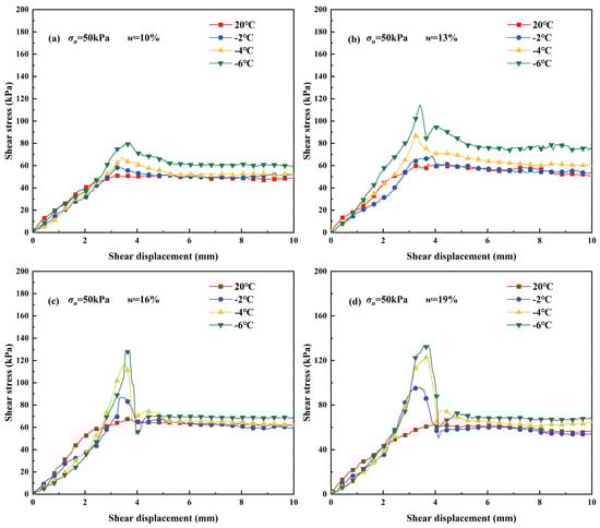 Shear stress–shear displacement curves under different temperatures. (a), water content w = 10%; (b), water content w = 13%; (c), water content w = 16%; (d), water content w = 19%.