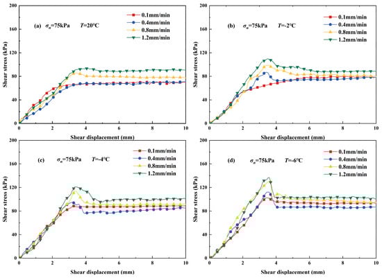 Figure 9 shows the interface τ-u curve at different shear rates and temperatures (σn = 75 kPa, w = 13%). As observed from Figure 9a, the τ-u curve at a temperature of 20 °C shows hardening characteristics at various shear rates. Although the curve shape remains relatively consistent as the shear rate v increases, the peak stress gradually rises. In Figure 9b, the τ-u curve shows hardening characteristics when v = 0.1 mm/min, but shows strain-softening characteristics at other shear rates. This softening phenomenon becomes more pronounced as v increases. At lower strain rates, the soil skeleton and cemented ice have creep deformation, and brittle failure does not occur easily, but at higher shear rates, the time for particle rearrangement on the interface is shorter, and the shear strength also increases accordingly [,,]. Comparing Figure 9b–d, obviously, the greater the influence of the shear rate on the interface τ-u curve and shear strength, the lower the temperature. Due to the refreezing of interfacial cemented ice, the residual shear strength increases with the decrease in the shear rate. Under negative temperature conditions, it is clear that the shear stress of v = 0.1 mm/min after shear stabilization (residual stage) is greater than that of v = 0.4 mm/min. This is because when v = 0.1 mm/min, the complete shear process of the sample takes 2 h, and the shear process is completely carried out in a constant temperature room. Part of the cemented ice that is constantly broken at the interface will refreeze during the shear process. This phenomenon will be more obvious at the lower temperature, resulting in the shear stress of v = 0.1 mm/min being greater than that of v = 0.4 mm/min after the shear stabilizes.