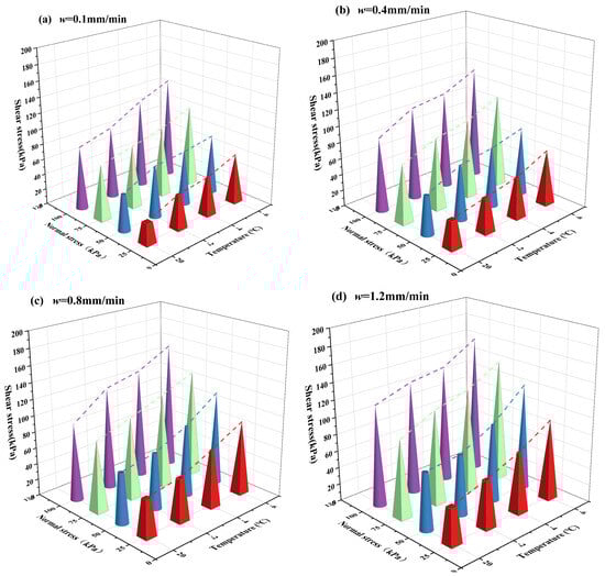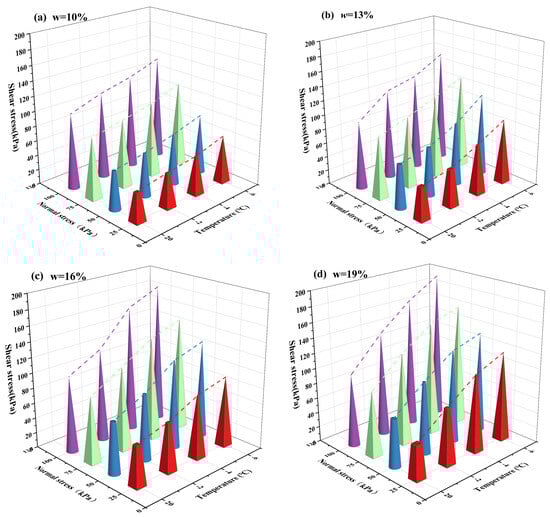 Figure 10 shows the peak shear strength (v = 0.8 mm/min) at virous σn, T, and w. It can be observed that the peak interface shear strength rises in conjunction with an increase in normal stress for a range of soils with varying water contents. As the normal stress rises, the contact areas between the soil and concrete also rise during the shear process, increasing the friction of the interface. The particles inside the interface soil also rearrange with the upsurge of normal stress, which increases the interface shear resistance [,]. As T declines, the peak shear strength of the interface demonstrates an upward trajectory. The presence of a considerable amount of free water within the soil structure allows for the gradual transformation of the majority of this water into cemented ice as the temperature decreases. This process contributes to an enhancement in the peak shear strength of the interface [,]. The overall change amplitude is the weakest when w = 10% (Figure 10a). Given the low free water content of the interface and the concomitant reduction in interface cementation, it is evident that the interfacial peak shear strength will be adversely affected. As the water content increases, the amplitude of change in the interfacial peak shear strength also becomes more pronounced. When w is 10%, 13%, 16%, and 19%, the peak shear strength at T = −6 °C and σn = 100 kPa increases by 258%, 237%, 246%, and 325%, respectively, compared with the peak shear strength at T = 20 °C and σn = 25 kPa.