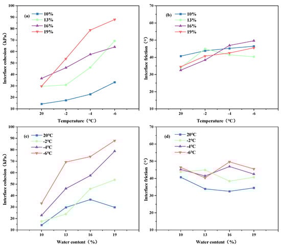 Interface shear strength parameters under different water contents and temperatures. (a) Interface cohesion–temperature curve at different water contents. (b) Interface friction–temperature curve at different water contents. (c) Interface cohesion–water content curve at different temperatures. (d) Interface friction–water content curve at different temperatures.