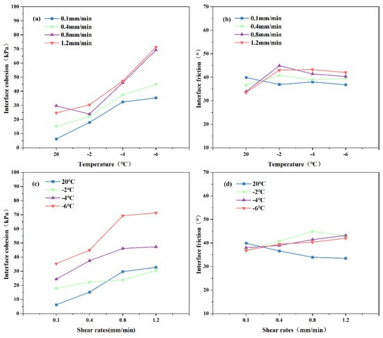 As illustrated in Figure 13a,b, with a reduction in temperature, the cohesion at the concrete–soil interface results in an overall increase in the shear rate. The interface friction angle shows no obvious change as the temperature decreases. As shown in Figure 13c,d, as the shear rate increases, the cohesion increases at all temperatures, and as the temperature drops off, the magnitude of the increase becomes progressively larger due to the rate-dependent properties of ice. The friction angle shows little influence from the shear rate. At positive temperatures, it is slightly decreased with the rising shear rate. That is because the faster shear rate makes less time for internal particle rearrangement, resulting in a decrease in the friction angle. While, at negative temperatures, it is slightly increased with the rising shear rate, that is due to the fact that ice cementation is a low- or no-friction material [].