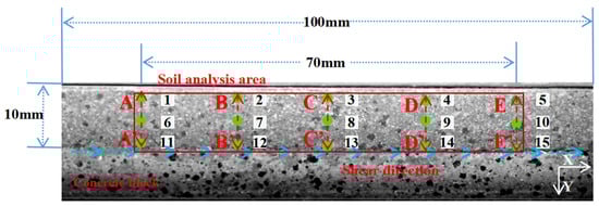 In this test, scattered spots were sprayed on the sample surface using paint, which can better identify the analysis area in the DIC analysis. The distance between the sample and the camera was about 25 cm, and a cold LED light was used to supplement the light on the sample surface, keeping the light intensity of the light source stable during all of the tests. In the process of sample shearing, a Nikon digital camera was used to take pictures of the deformation of the soil surface in the process of shearing, and the image size of the captured area was 5568 pixels × 3712 pixels, with an image resolution of 300 dpi. In order to avoid the influence of the boundary effect on the mechanical properties of the interface, a certain gap was left outside the DIC analysis area. The shear rate of the specimen was 0.8 mm/min, and the images were collected every 6 s until the end of the test. The DIC analysis was performed using the analysis software developed by Xintuo 3D Technology Co. Ltd. (Shenzhen, China) (www.xtop3d.cn), which has the same general principles as other DIC software or PIV software but has been optimized in terms of visualization and parameter settings, and its capability of fixing a group of images at a fixed shooting position is automatically calibrated in the software. Only the analysis area and the tracking area range need to be set during the analysis process.