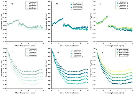 Displacement change curves of the X-axis and Y-axis during shearing under different rates. (a) Horizontal displacement vs. shear displacement under v = 0.1 mm/min. (b) Horizontal displacement vs. shear displacement under v = 0.4 mm/min. (c) Horizontal displacement vs. shear displacement under v =1.2 mm/min. (d) Vertical displacement vs. shear displacement under v = 0.1 mm/min. (e) Vertical displacement vs. shear displacement under v = 0.4 mm/min. (f) Vertical displacement vs. shear displacement under v = 1.2 mm/min.