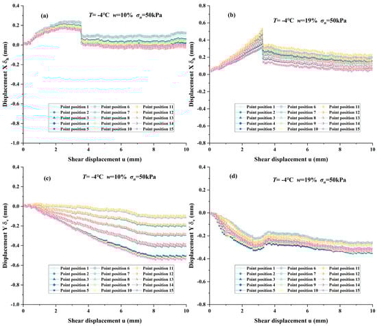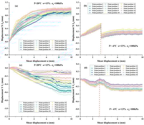 Figure 16 shows the variation of horizontal displacement X (δh) and vertical displacement Y (δv) during the interface shearing process (at 20 °C and −6 °C under the conditions of v = 0.8 mm/min, σn = 100 kPa, and w = 13%). It can be observed from Figure 16a,b that at 20 °C, with the increase in shear displacement, the δh gradually increases, and the final value of δh at all monitoring points is between 0.77 mm and 1.03 mm. At −6 °C, the variation of δh at each monitoring point significantly differs from that in the melting state. There is a significant mutation of δh near u = 3 mm because cemented ice forms inside the soil at the interface during freezing, and the soil is frozen as a whole. The frozen soil exhibits a high degree of stiffness. Following the attainment of the peak value, the interface undergoes a brittle failure, resulting in the soil rebounding (as shown by the dotted line in Figure 16b). This phenomenon gives rise to a mutation in the displacement of the interface soil. Subsequently, δh gradually increases, and the final value is between 0.09 mm and 0.28 mm.