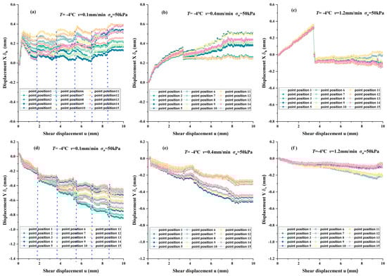 Figure 18 contains curves showing the changes in horizontal displacement X (δh) and vertical displacement Y (δv) of the tracking point under different shear rates (at T = −4 °C, σn = 50 kPa, w = 13%). From the changes in δh in Figure 18a–c, it can be observed that as the shear rate grows, the degree of dispersion, as indicated by the value of δh, gradually decreases. Furthermore, the dispersion of δh at each monitoring point in the interface tends to aggregate. This phenomenon is caused by the combined effect of normal stress and a slower shear rate. The slower shear rate and the applied normal stress enhance the interaction between soil particles inside the soil, resulting in the dispersion of each δh tracking point. The displacement fluctuation phenomenon at a rate of 0.1 mm/min is no longer obvious at a 0.4 mm/min rate. After the interfacial cemented ice of the frozen soil is destroyed, the slow shear rate and the effect of normal stress cause the interface to repeatedly refreeze, resulting in continuous displacement fluctuations (as shown by the dotted line in Figure 18a).