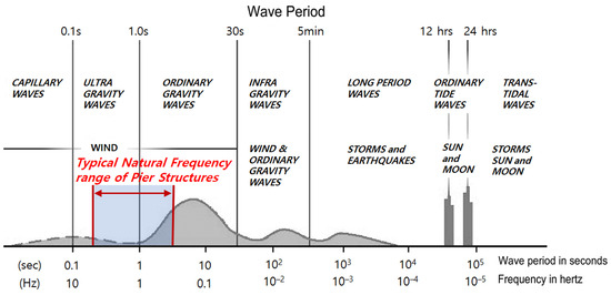 Figure 1 presents a relevant schematic. Pier structures experience wave forces within the 0.05–1.0 Hz range (at periods of 20.0–1.0 s). As the general natural frequency range of pier structures is 0.25–4.0 Hz (at periods of 4.0 to 0.25 s) [4,5,6], the frequencies of naturally occurring waves have been confirmed to significantly overlap with the natural frequencies of these structures. This suggests that dynamic wave effects on pier structures can amplify the structural responses. The effect of waves with frequencies similar to the natural frequencies of pier structures can lead to progressive, severe damage. A continuous wave effect can result in cumulative damage states that are similar to long-term fatigue.